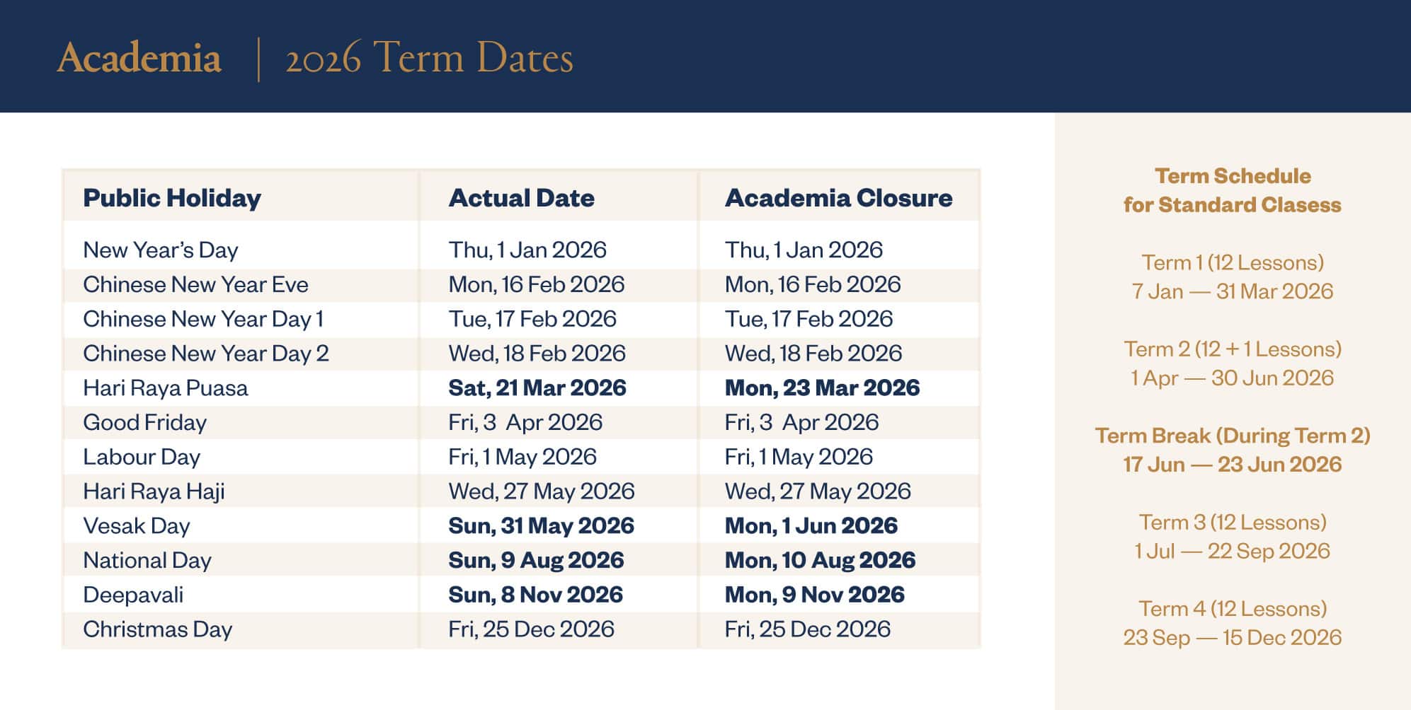 Our full schedule can be found at https://academia.com.sg/schedules/